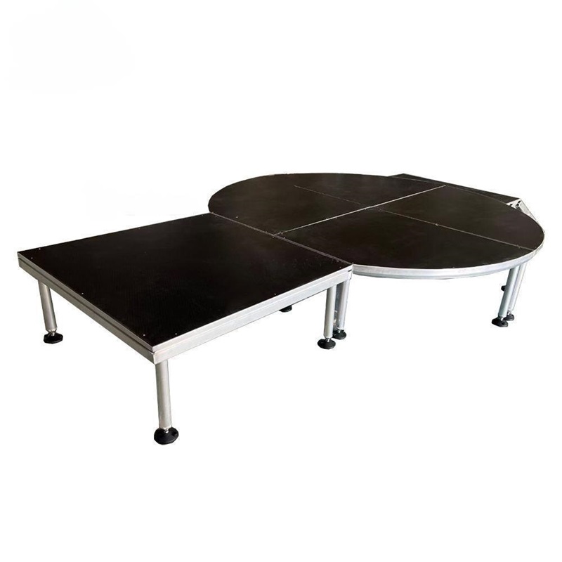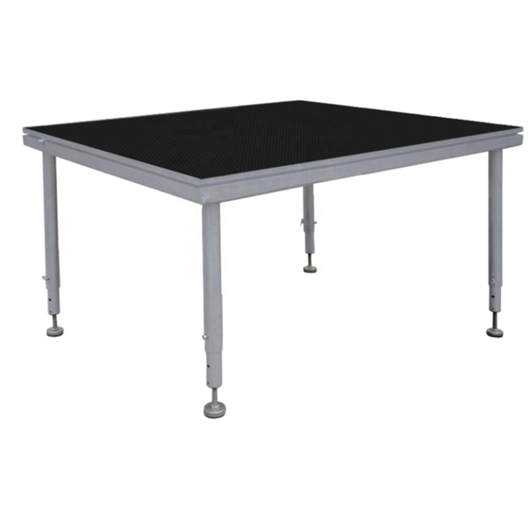 O palco portátil de alumínio com sistema de encaixe rápido possui pernas ajustáveis que podem ser configuradas em diversas alturas, variando de 0,3 m a 1,2 m. Isso permite que o palco seja adaptado a diferentes espaços para eventos e atenda a diversas necessidades de apresentações. A cor da plataforma também pode ser personalizada, com opções como preto, vermelho, azul, cinza e outras cores personalizadas. Isso permite que o palco seja integrado perfeitamente ao design geral do evento.