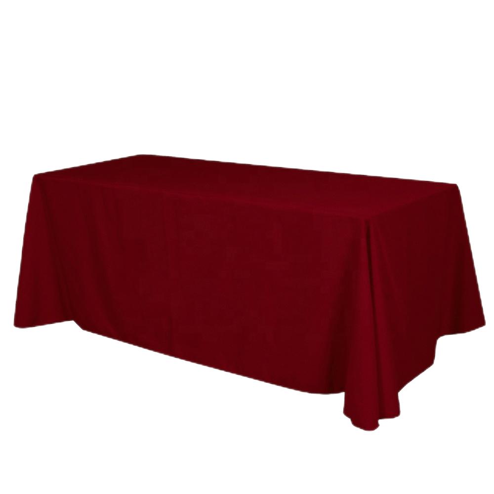 Toalha de mesa retangular em poliéster retardante de chamas para eventos e feiras comerciais.